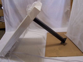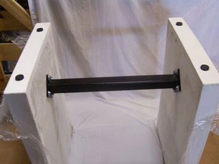 - Place four bolts in each flange and leg, the thread on washers and nuts and tighten.
